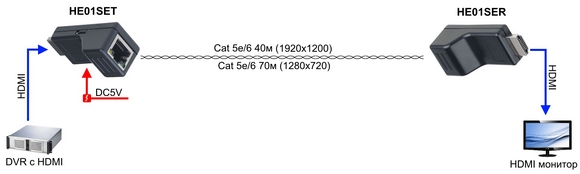 Миниатюрный комплект HE01ERK для передачи HDMI по кабелю витой пары на расстояние до 70м
